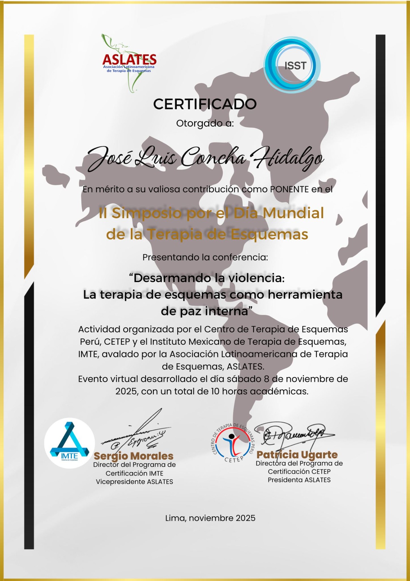 ¡Quiero expresar mi más sincero agradecimiento a ASLATES, CETEP Perú y el Instituto Mexicano de Terapia de Esquemas (IMTE) México por la increíble oportunidad de participar como ponente en el II Simposio por el Día Mundial de la Terapia de Esquemas!